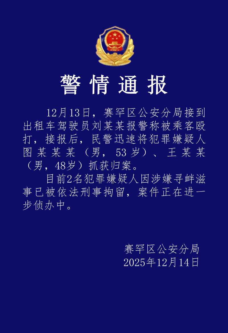 呼和浩特一出租车司机遭乘客殴打,警方通报:两名嫌疑人被刑拘